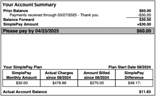 SimplePay is opt-in, so you would have had to request enrollment. To check, look at the first page of your most recent CMP bill. If you see “SimplePay Amount” in the Your Account Summary section (see example below), you’re enrolled.