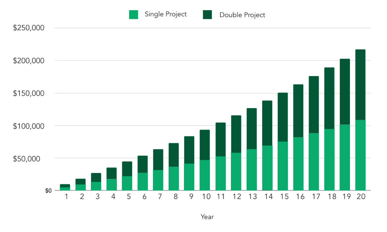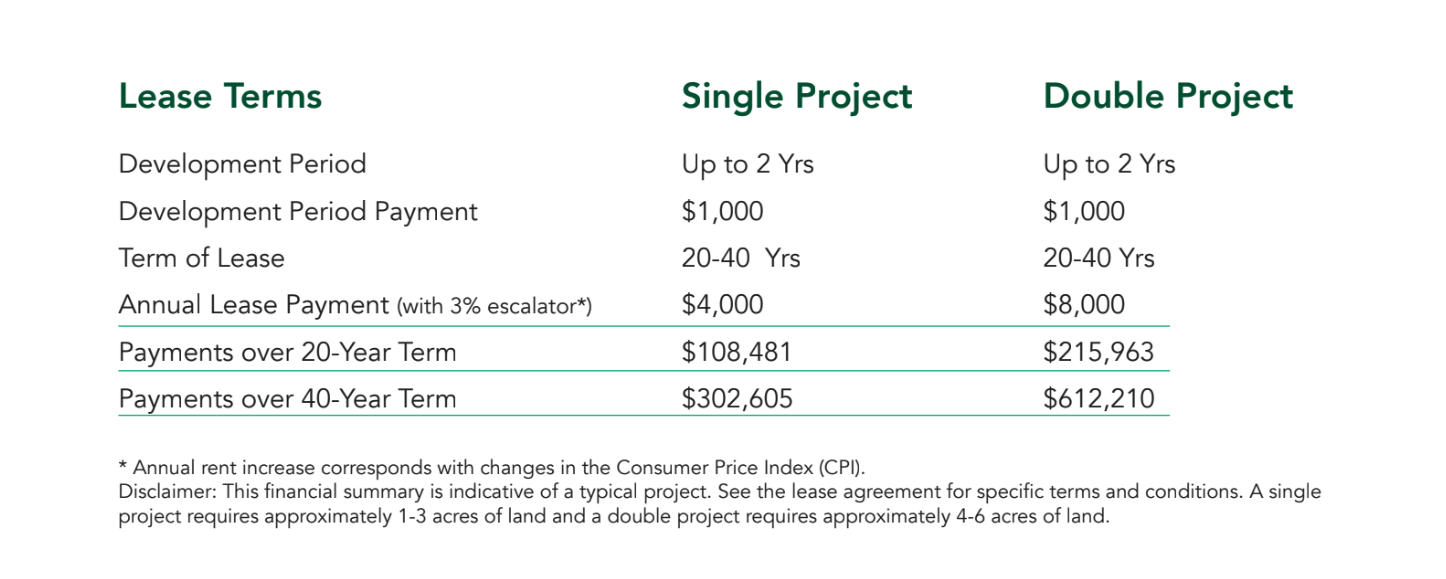We offer 20-year land leases with the option to extend to 40 years. Our annual lease payment is $4,000 per project, with payments escalating annually to match inflation. If your property is suitable for two projects the annual rent payment doubles to $8,000 per year — providing you with over six figures of stable, passive income over the life of the lease. Check out what this could look like for you below.